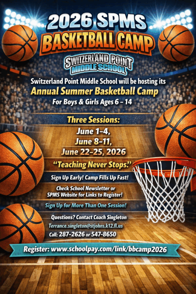 Basketball Schedule Basketball Coaches Boys Coach: Mr. SingletonGirls Coach: Ms. Richardson Ticket Sales – Coming January 2027Tickets need to be purchased online. ($4.00) Purchases can be made 1 week prior to the game by clicking the link on this page.***Please bring your receipt or be prepared to show your electronic purchase at the entrance to the gym.***Season TicketClick Here to Buy TicketsGamble Rogers Middle School (1/27/26):Click Here to Buy TicketsMurray Middle School (1/29/26):Click Here to Buy TicketsLandrum Middle School (2/3/26):Click Here to Buy TicketsSebastian Middle School (2/5/26):Click Here to Buy TicketsPacetti Bay Middle School (2/10/26):Click Here to Buy TicketsFruit Cove Middle School (2/12/26):Click Here to Buy Tickets There will be no refunds for unattended games. Thank you for understanding.