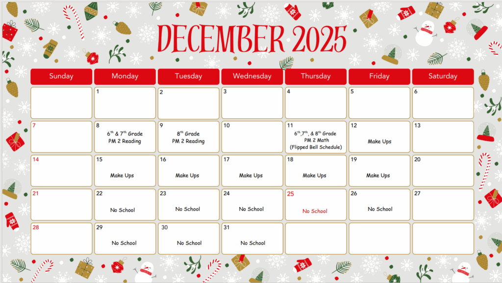 As shown on the calendar, make-up days will be held on a continuous basis. Students will be notified by their first period teacher if they need to attend a testing make up session. ~